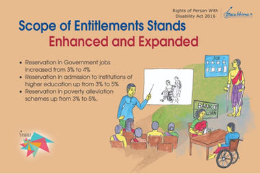 In the new Law, Disability has been defined based on an evolving and dynamic concept and the types of disabilities have been increased from existing 7 to 21 and the Central Government will have the power to add more types of disabilities. Speech and Language Disability and Specific Learning Disability, acid attack and Parkinson’s disease have been added for the first time. The new Law provides for penalties for offences committed against persons with disabilities and also violation of the provisions of the new law. Special Courts will be designated in each district to handle cases concerning violation of rights of PwDs. Reservation in vacancies in government establishments has been increased from 3% to 4% for certain persons or class of persons with benchmark disability. The Office of Chief Commissioner of Persons with Disabilities has been strengthened who will now be assisted by 2 Commissioners and an Advisory Committee comprising not more than 11 members drawn from experts in various disabilities. Every child with benchmark disability between the age group of 6 and 18 years shall have the right to free education.